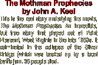 The Mothman Story “From November 1966 to December 1967 one of the strangest events in ufological history took place in Point Pleasant, West Virginia. John Keel’s Mothman Prophecies was written about this tragic series of encounters with a bat-like, winged creature that had a humanlike appearance. Mothman, as he was dubbed, stood between six and seven feet tall, was gray in color, and had wings like a bat - featherless. He had a man’s legs and huge, hypnotic red eyes. He was seen by dozens of people with some witnesses standing face-to-face with the creature. The events ended when the Silver Bridge collapsed into the Ohio River on December 15, 1967 during an afternoon traffic jam.” From: Grand Illusions (Little, 1994) Before more of the story is told, it should be noted that Keel has pointed out that a host of similar creature reports have been made. In the 1930’s and 1940’s, a similar creature was encountered in the former Soviet Union. In addition, reports have come from Texas and elsewhere. In his book The Mothman Prophecies, Keel related the reports to Native American mounds and sacred sites on the Ohio River. These statements played a role in leading the present writer to an avid interest in mounds and ancient rituals involving mound complexes. In People of the Web (1990), I told the story of Mothman in a sort of travel and investigative book. In November of 1986, my wife and I drove to Point Pleasant exactly 20 years to the day that the Mothman event began. “It was late, dark and raining, but we could see the Ohio River clearly as we sped closer to Point Pleasant on Route 2. As the second Friday of November 1986 was passing into Saturday morning, the discussion between my wife, Lora, and me centered on Mothman and John Keel. The rain, patches of fog, and darkness intensified our discussion to create an eerie feeling in us. We almost expected to see a winged monster with red, glowing eyes any second. The event would only last a moment or so. We would see the monster standing in the center of the road peering directly at us with his hypnotic gaze. As soon as we noticed him, he would be gone. “Lora mentioned how the taillights of the cars in front of us looked like eyes. I normally don’t get spooked, but I was feeling peculiar and antsy. I wanted to stop driving and sleep. It was nearing midnight and we were both tired. “Soon we were looking at the spot where the bridge at Point Pleasant collapsed. I was struck by the immense tragedy it must have been for the area. “We stopped at a small store in downtown Point Pleasant and asked where the nearest motel was. About 15 minutes later Lora and I were arguing about whether to stay there or not. I wanted to spend the night in Point Pleasant, but definitely not at this hotel . . . “In November 1966, exactly 20 years before we drove through Point Pleasant, the Mothman made his first appearance 10 miles north of Point Pleasant. The tragic Mothman episode is one of the best-known and most bizarre cases in all of UFO and apparitional history . . . “The Ohio-West Virginia Mothman episode lasted exactly 13 months (November 15, 1966 to December 15, 1967). The Mothman, often associated with UFO sightings, was seen by an enormous number of people . . . “On November 15, 1966 at 11:30 p.m., two newlywed couples were driving around the TNT area. ([Note: the TNT area is an abandoned WW II munitions plant 10 miles north of Point Pleasant.] As they drove past an abandoned generator plant, one of the women, Linda Scarberry, pointed out two large, red glowing eyes staring at them from the blackness. As the huge eyes moved away from the building, they could see they were part of a large figure. A six to seven-foot-tall creature now stood in front of them. They could clearly see gigantic wings folded behind its back. It was gray and stood on legs like a man’s. “Stricken with terror, the witnesses began fleeing from the creature ... As they made a curve in the road, they spotted the creature again. It was standing on a hill just looking at them. As soon as they all noticed it, it shot straight up into the air without flapping its wings. “Because he trusted the word of the four witnesses, deputy sheriff Millard Halstead drove out to the TNT area to investigate. Halstead didn’t find the Mothman, but his radio wouldn’t work while he was in the area. A loud garbled noise was all that would come out of the radio while he was there. “During its rein of terror and lunacy over the Point Pleasant area, the Mothman was seen by over 100 adults and many more children and teens. Hundreds of people spent evening after evening sitting in their cars at the TNT generator and munitions plants hoping to spot the creature. UFOs and moving lights were regularly seen in the skies surrounding the area. In addition, bizarre animal mutilations plagued the area. “The Mothman episode is characterized, in large part, by its utter absurdity. The area took on a carnival atmosphere as events progressed. Phones didn’t work right, radios blurted out strange messages, animals disappeared, UFOs were seen everywhere, ‘investigators’ turned up all over the area, and Mothman would just walk up to farmhouse doors or fly over restaurants. “On January 11, 1967 at 5:00 in the afternoon, Maber McDaniel was walking toward the restaurant on Route 62. She spotted what she first though was a small plane soaring low over the highway. As the object came closer into view she was frozen with terror as she realized she was looking at a giant ‘man’ with outstretched wings and feet hanging down. “On December 4, 1966, five pilots were standing at the Gallipolis, Ohio airport. Gallipolis is just on the other side of the Ohio River from Point Pleasant. One of the men pointed out a strange object approaching them from the Ohio River. They quickly realized they were viewing a gigantic ‘bird’ that was silently soaring toward them at an estimated 70 mph. Its wing