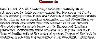 by Dr. Greg Little The movie, The Mothman Prophecies, may well stimulate revived interest in John Keel’s work and speculations on UFOs. Keel (pen name of Alva John Kiehle) was born in 1930 and began professional writing at age 16. His book Jadoo (1957) documented his early efforts to find the mythical Abominable Snowman in the Alps. During these early travels in the far east, Keel was allowed to walk among snakes, learn the Indian rope trick, and be buried alive (among other things). A science writer for Funk & Wagnalls encyclopedia, he also wrote for various television and radio shows. | ||||